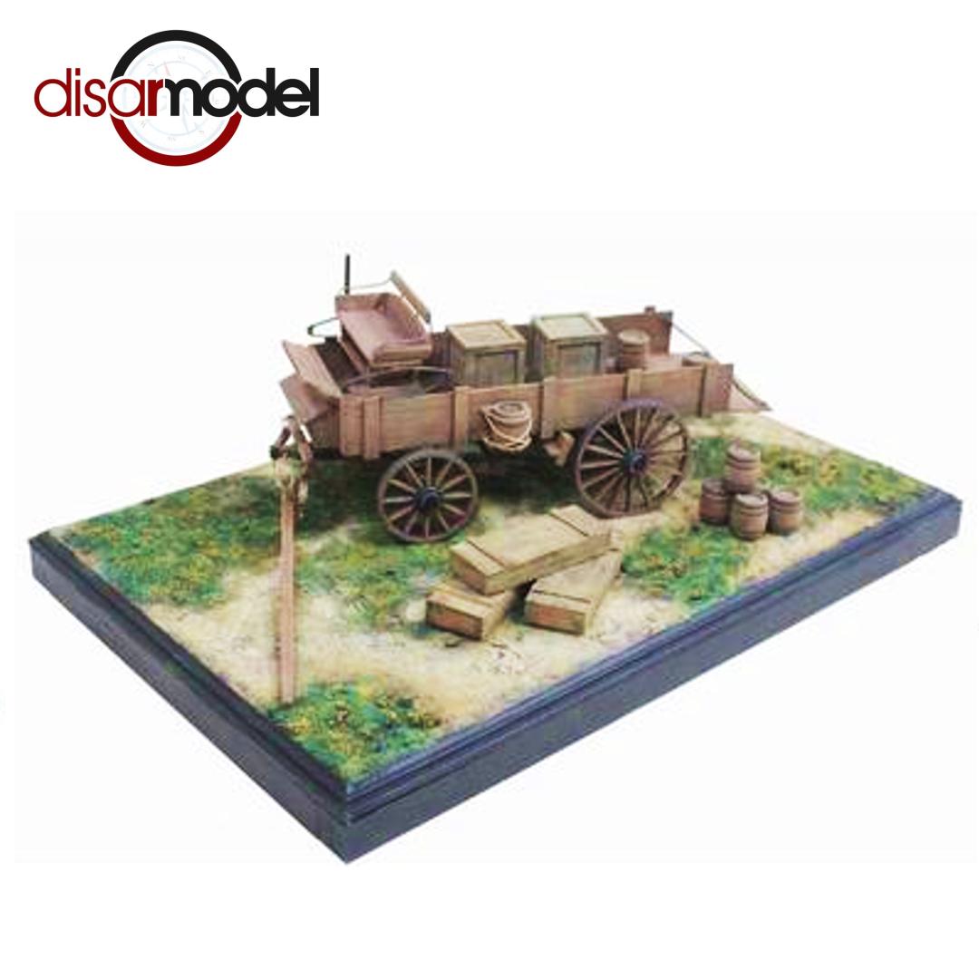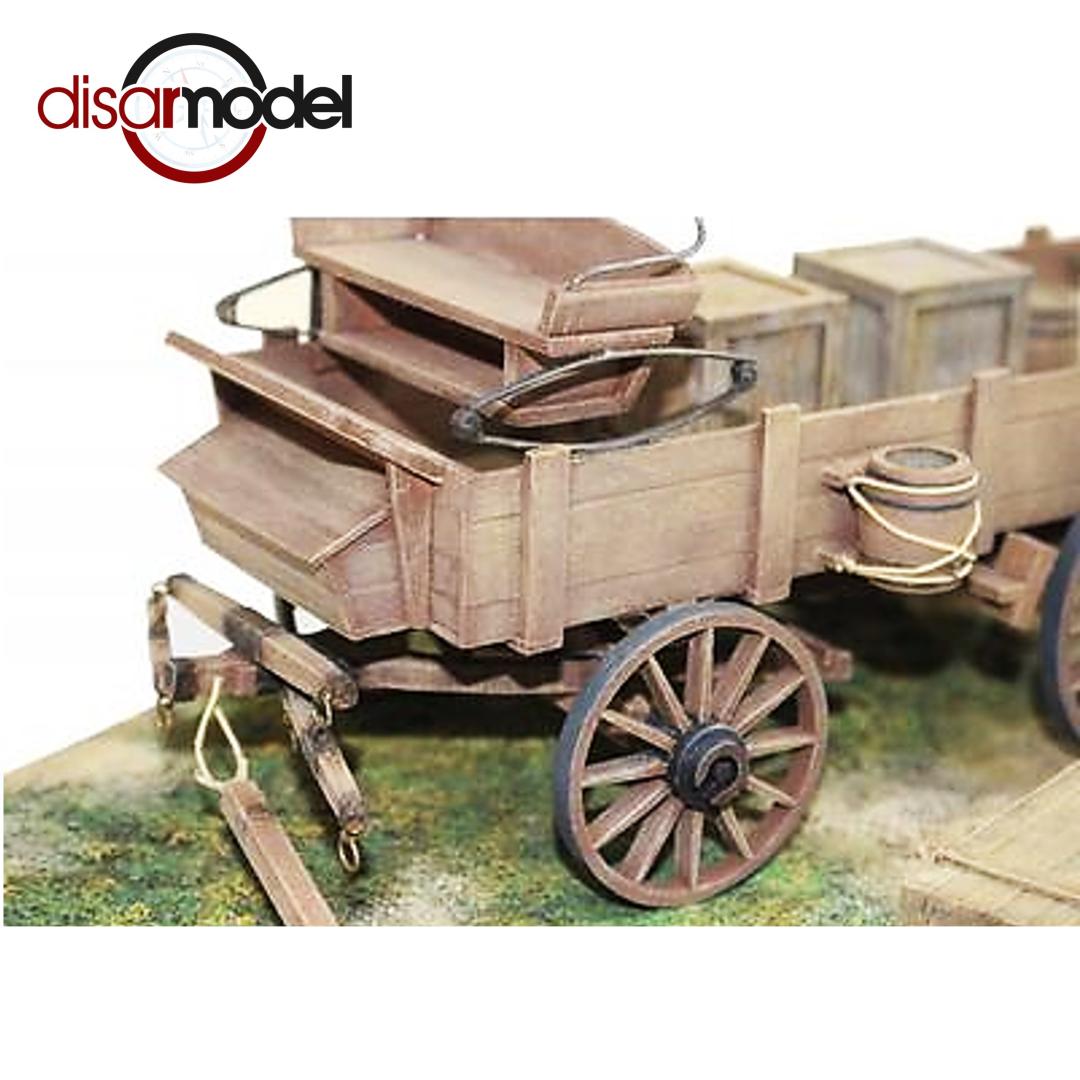 Kit de montaje en madera "Old West Wagon" Largo: 450mm Alto: 180mm Ancho: 290mm Escala: 1/20 Nivel: Iniciados Se incluyen todas las componentes para la realización del Diorama salvo las pinturas.