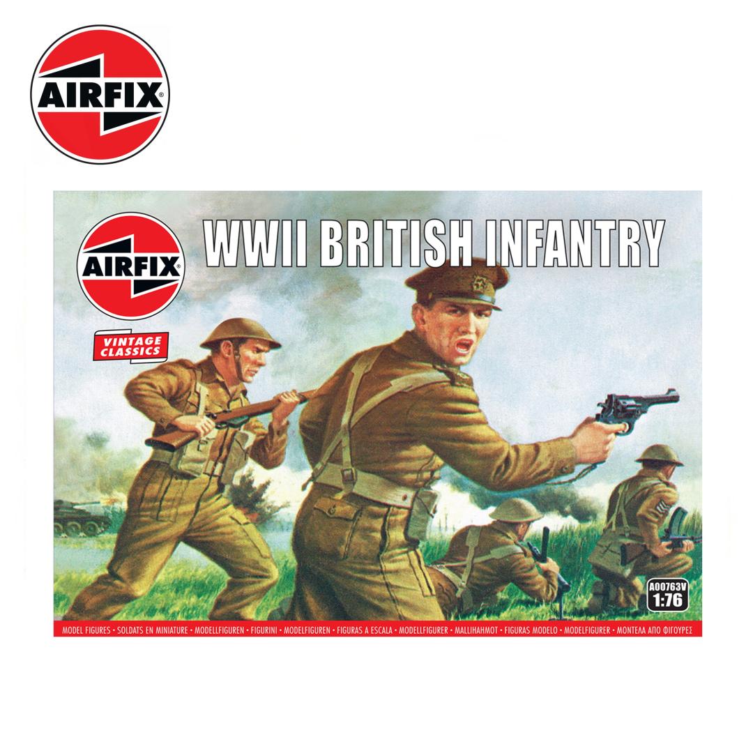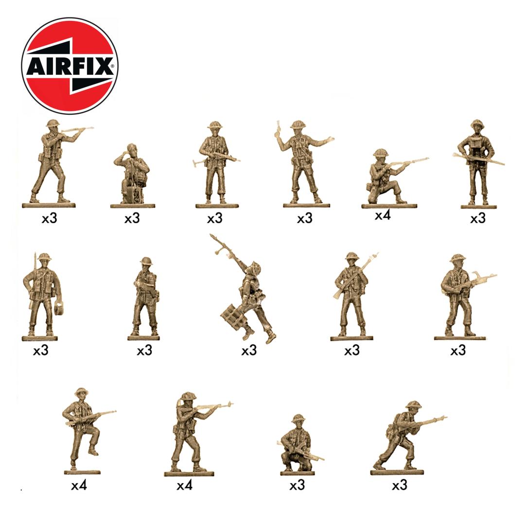 Esta colección a escala 1:76 incluye 48 figuras de plástico sin pintar, que representan a oficiales y soldados de la infantería británica en el noroeste de Europa desde 1944 en adelante. Vestidas con los uniformes y el equipo típicos de la época del Día D, estas figuras están equipadas con armas auténticas de la época y combinan a la perfección con una variedad de productos Airfix
