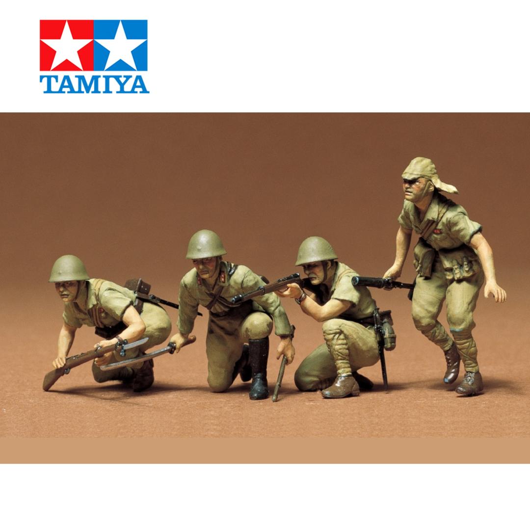 Este kit de montaje de figuras de plástico a escala 1/35 recrea cuatro soldados de infantería del Ejército Imperial Japonés de la Segunda Guerra Mundial. ★Garantizado para añadir realismo a cualquier diorama de maquetas japonesas, el set incluye una figura de oficial blandiendo su espada en una mano, además de otras tres figuras que representan a soldados en pose de acción. ★Las figuras llevan uniformes para clima cálido, y el modelista puede elegir entre piezas que representan cascos o gorras de tela. ★Los accesorios incluyen rifles Tipo 38 y lanzagranadas Tipo 89, binoculares para el oficial, una bolsa para mapas y mucho más.