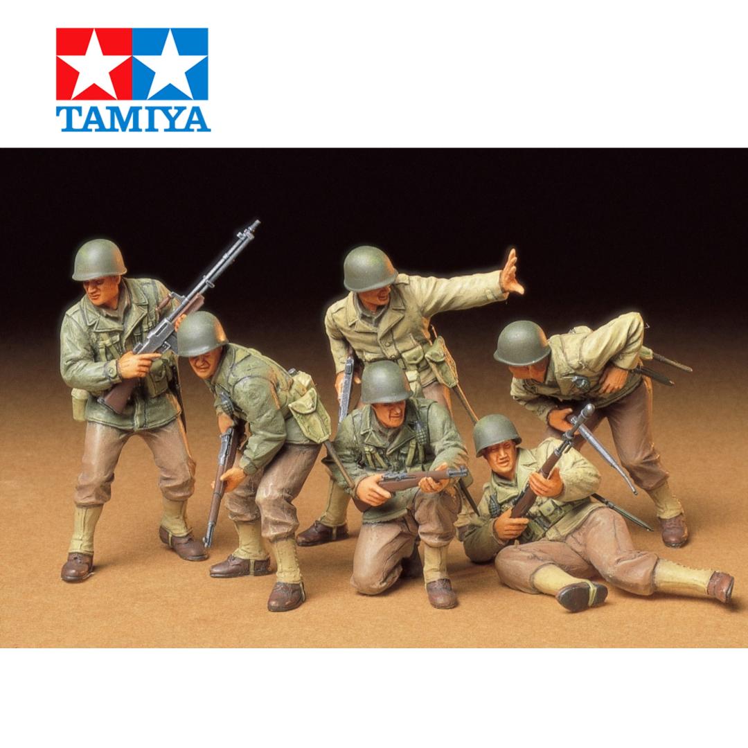 Este set de maquetas de plástico para armar presenta a seis soldados estadounidenses de la Segunda Guerra Mundial (dos suboficiales y cuatro soldados de infantería) en diversas poses dinámicas de combate. ★Estas figuras llevan auténticas chaquetas de campaña M1941 y M1943 y mallas de lona. ★La tensa situación de la batalla se aprecia claramente en las expresiones de los modelos, como las de los suboficiales que dan instrucciones a sus hombres que esperan la orden de ataque. ★Armas como los fusiles M1 Garand y la metralleta Thompson tienen un acabado realista y nítido.