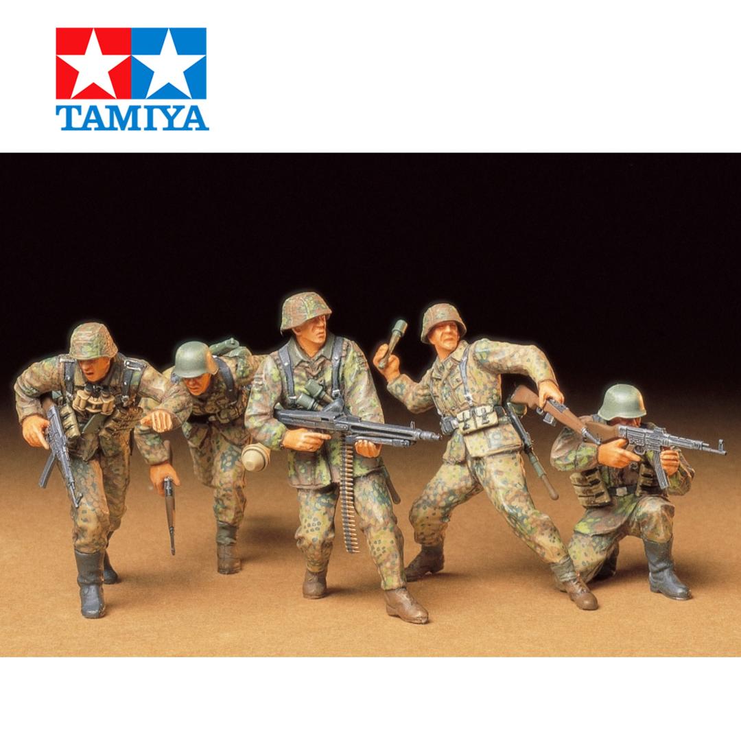 Durante la Segunda Guerra Mundial, los soldados alemanes pertenecientes a divisiones blindadas vestían uniformes de camuflaje y de campaña M44. Este kit de plástico para armar incluye cinco figuras: un suboficial y un soldado en pose de carga, armados con un Panzerfaust y un fusil de asalto MP44; un soldado disparando una ametralladora MG42 desde la cintura; un soldado lanzando una granada de mano; y otro suboficial disparando su MP44 desde las rodillas. Las armas y accesorios, como botellas de agua y fundas para máscaras de gas, tienen un acabado impecable y detallado. ¿Por qué no exhibir este set con una maqueta de un vehículo blindado alemán, como un Sd.Kfz. 251/1?