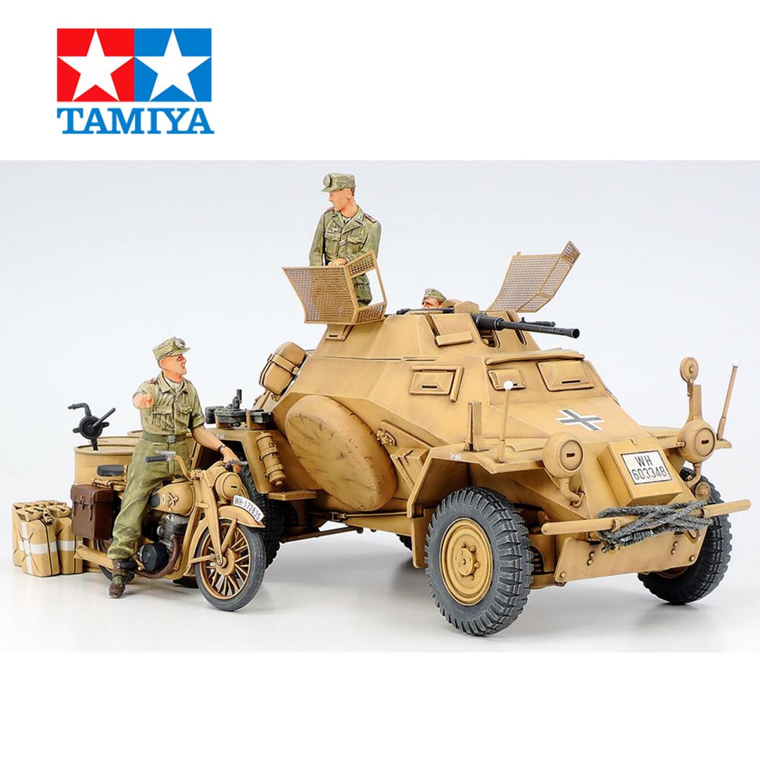 Recrea escenas del frente del desierto. El Sd.Kfz.222 era un vehículo blindado 4x4 utilizado por el ejército alemán para misiones de reconocimiento. Estaba bien armado, con un cañón de 20 mm y una ametralladora en su torreta abierta, protegida de granadas y fragmentos por cubiertas de malla metálica. Impulsado por un motor de 90 CV refrigerado por líquido montado en la parte trasera, alcanzaba una velocidad máxima en carretera de 70 km/h y una velocidad máxima campo a través de 40 km/h. El Afrika Korps del famoso mariscal de campo Erwin Rommel utilizó estos vehículos blindados en el desierto norteafricano para operaciones de exploración y ofensiva, junto con la motocicleta DKW NZ350.