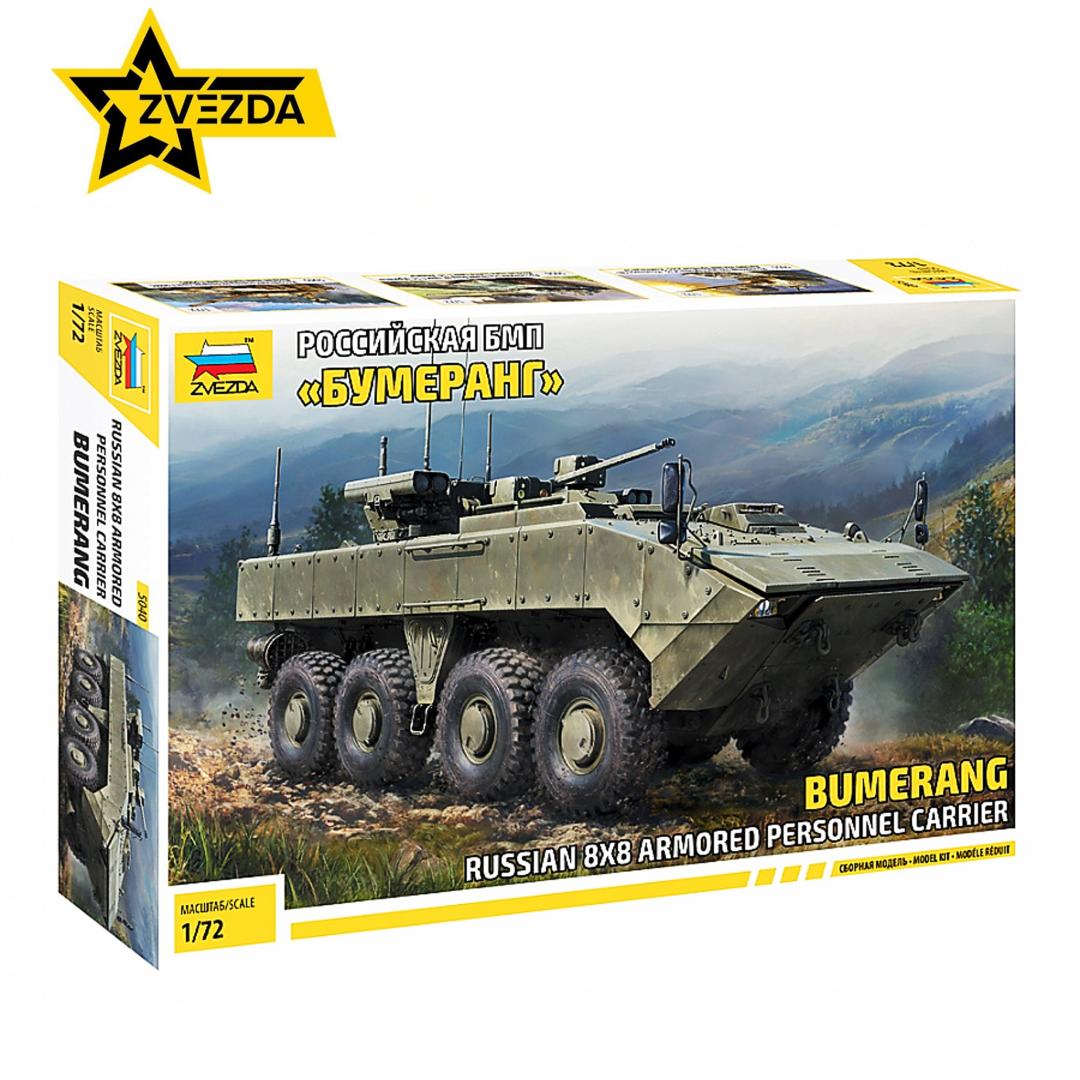 El «Bumerang», vehículo de combate de infantería anfibio ruso de ocho ruedas, se basa en la plataforma de combate universal Bumerang y está diseñado para transportar unidades, proporcionar fuego de apoyo en combate, destruir tropas, armas antitanque y vehículos blindados ligeros enemigos. Su armamento consiste en el módulo de combate universal «Epoch» (Bumerang-BM) con un cañón automático 2A42 de 30 mm y un sistema de alimentación selectiva de munición (500 cartuchos), una ametralladora Kalashnikov de 7,62 mm (2000 cartuchos) y dos sistemas de misiles antitanque gemelos Kornet. Tiene una tripulación de tres personas y puede transportar de siete a ocho soldados. El vehículo de combate de infantería Boomerang se presentó por primera vez al público en el Desfile del Día de la Victoria de Moscú de 2015.