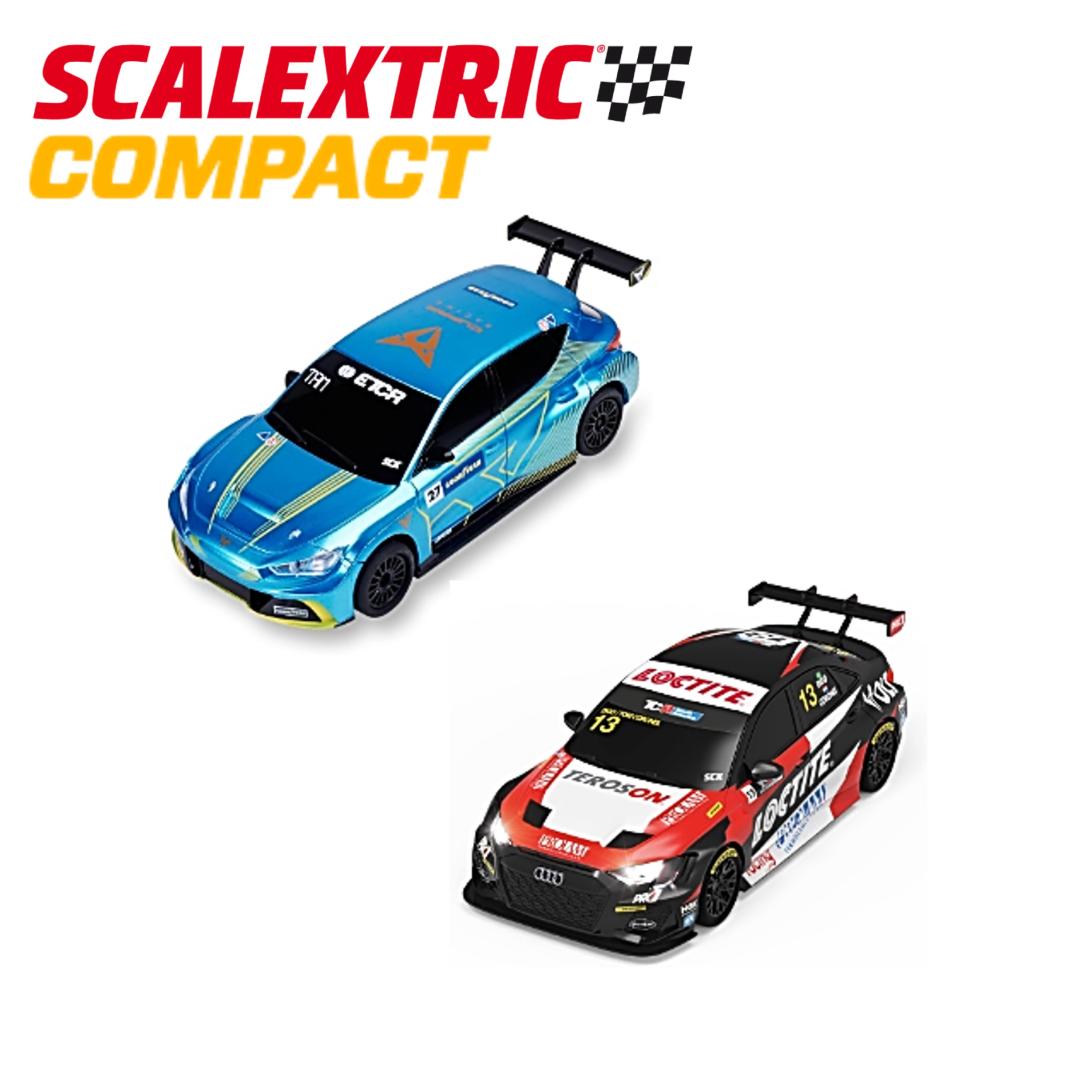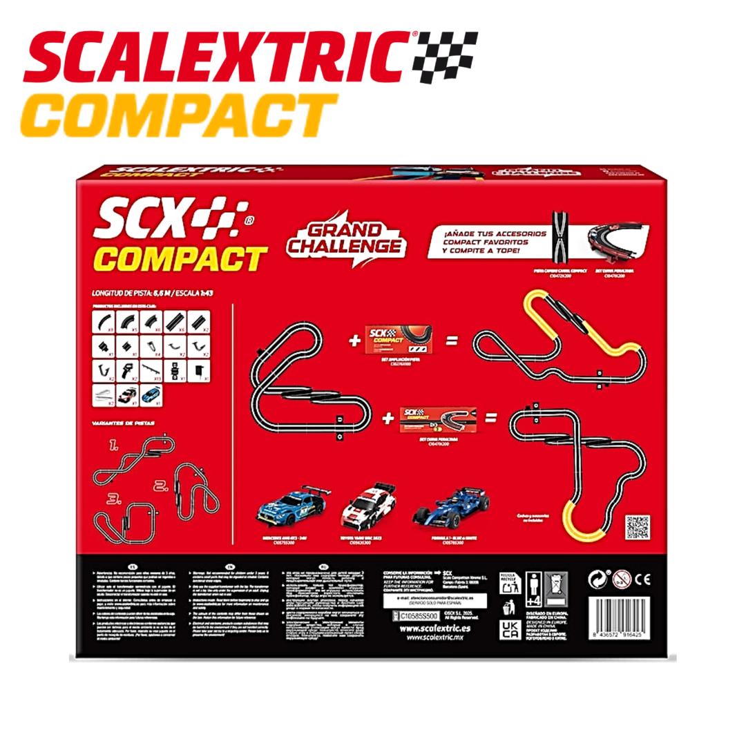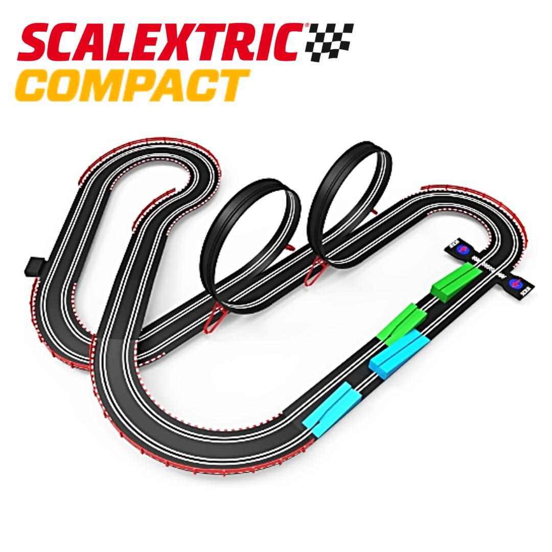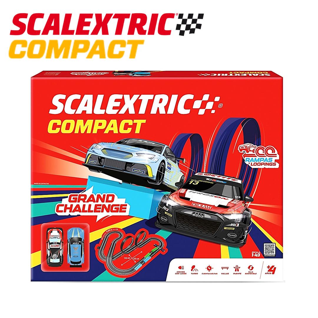 Scalextric Compact con 6,6 metros de recorrido de pista, escala 1:43. Mandos específicos para la mano del niño y con turbo para experimentar una aceleración espectacular. Dos coches con luces incluidos. Espectacular looping de doble rizo, puente, vallas, cuentavueltas y dos espectaculares rampas para dar increíbles saltos. ¡Adelanta a tu compañero y sé el primero en pasar por la meta! Pon a prueba tu experiencia de piloto y compite a tope!.