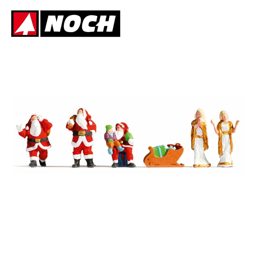 Fabricado en escala H0 (1:87), el set incluye tres Papá Noeles con atuendos tradicionales, uno de ellos sentado, dos ángeles con túnicas blancas brillantes y capas doradas, y un detallado trineo cargado de coloridos regalos.