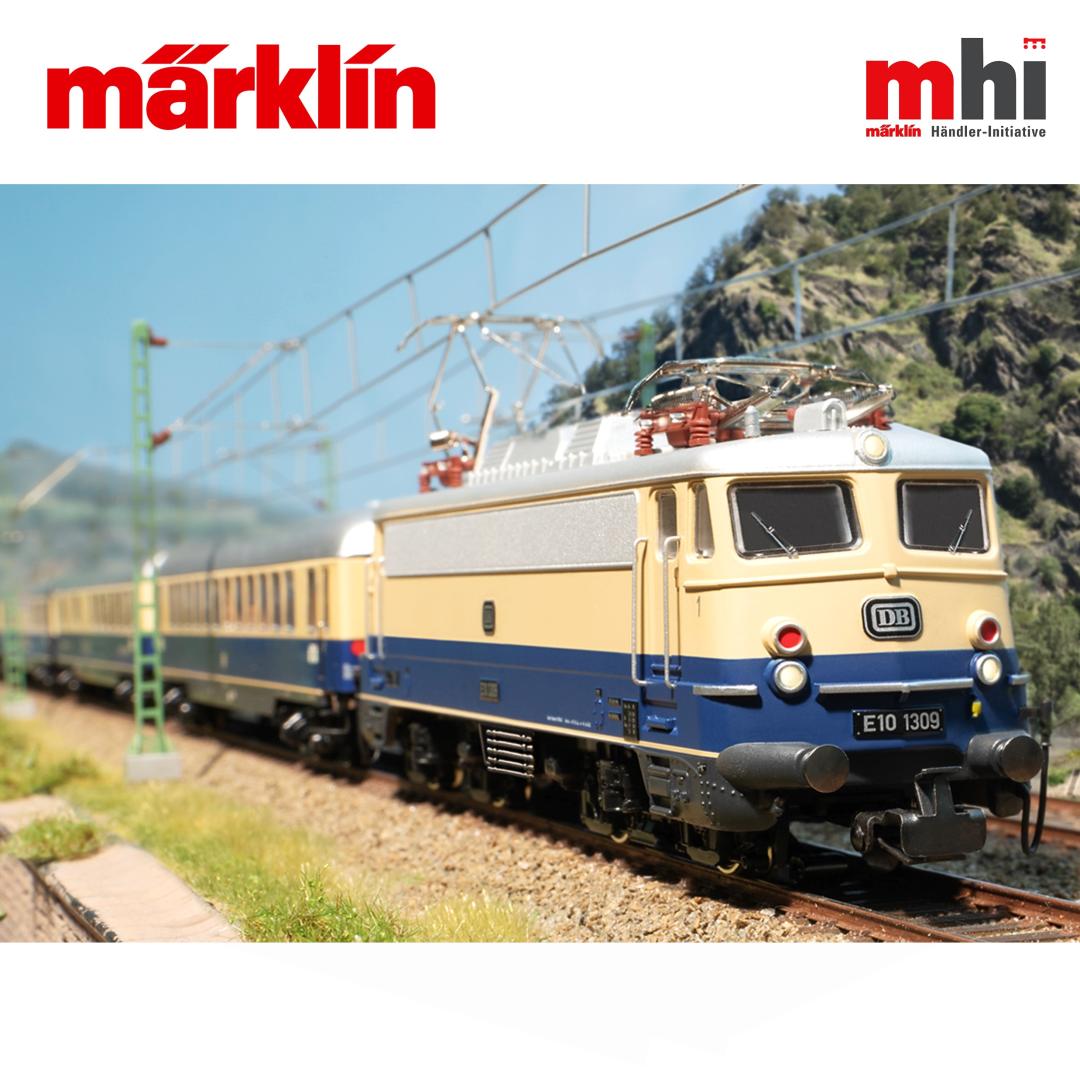 La E10 era la locomotora eléctrica con la que los Ferrocarriles Federales Alemanes dieron el gran salto adelante durante los primeros años del Milagro Económico. En 1956 comenzó la producción regular de esta locomotora de 5000 caballos de fuerza, que alcanzaba los 140 km/h (87,5 mph). Estas locomotoras, fiables y elegantes, pronto poblaron las vías de la DB por cientos. En 1965, Märklin lanzó al mercado un modelo de la E10 que brillaba como el prototipo real, destacando por su robustez y fiabilidad. Su excelente nivel de detalle, junto con una tecnología de propulsión probada y una carrocería robusta de fundición a presión, convirtieron a la Märklin E10 en un éxito de ventas. Sin embargo, en aquel momento no se fabricó un modelo de la E10.3 "Bügelfalte" (con pliegues), ni tampoco la variante azul/beige para su uso a 160 km/h (100 mph) en los nuevos trenes de lujo "Rheingold" y "Rheinpfeil". Ahora, sin embargo, el anhelo de muchos fanáticos de Märklin por fin se hace realidad: una locomotora retro azul cobalto/beige de la clase E10.12 con el característico diseño de pliegues de pantalón. Este magnífico modelo incorpora la tecnología más avanzada, y su exterior está fabricado en metal fundido a presión de gran tamaño, lo que le confiere un aspecto que recuerda a la perfección la época dorada de los Ferrocarriles Federales Alemanes y a los legendarios modelos metálicos de Göppingen.