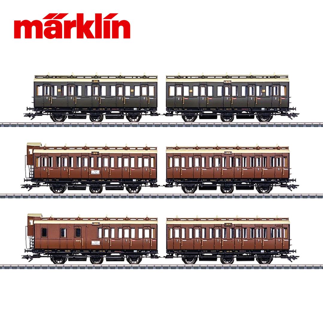 Modelo: El conjunto de vagones puede alimentarse con corriente desde la locomotora de vapor P 8 (número de artículo 39381) mediante los enganches cortos conductores de corriente integrados. Los pares de vagones compartimentos están acoplados permanentemente. Los ejes centrales de los vagones tienen holgura lateral para un mejor rendimiento en curvas. Cada par de vagones se embala individualmente.