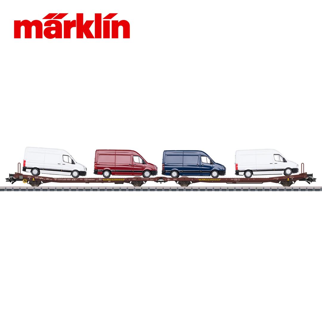 Modelo: Ambas mitades del vagón plataforma están construidas en metal. Presentan numerosos detalles aplicados por separado, como conductos de freno, depósitos de aire, placas de cruce, escalones y sistema de frenado. Incluyen un volante para el ajuste de los frenos. La altura del tope cumple con la normativa NEM. Disponen de un acoplamiento rígido prototipo con mecanismo guía entre las mitades del vagón. Se incluyen calzos para la parte superior y el piso de los vagones, así como mangueras de freno, como piezas para su instalación por separado. Los vagones están cargados con cuatro unidades VW Crafter de la empresa Schuco. Longitud entre topes: 32,4 cm / 12-3/4". Juego de ruedas DC E414237.
