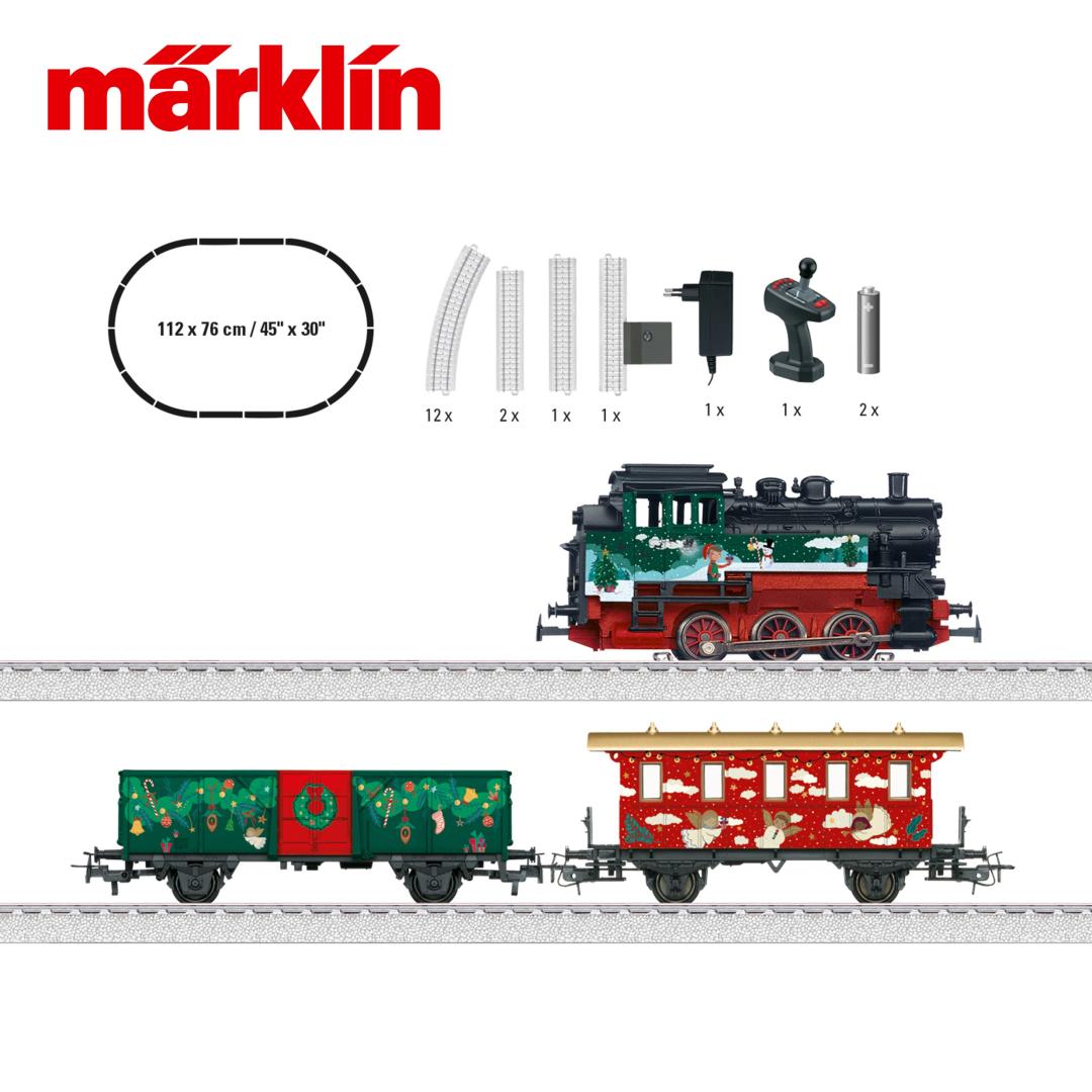 Todas las vías son blancas con efecto brillante. Incluye una lámina recortable de "Regalos de Navidad". El set incluye una fuente de alimentación conmutada y un mando inalámbrico por infrarrojos fácil de usar: el Märklin Power Control Stick. Se incluyen 2 pilas AAA. Este set se puede ampliar con el set de extensión de vías C "Vías Nevadas" (20124).
