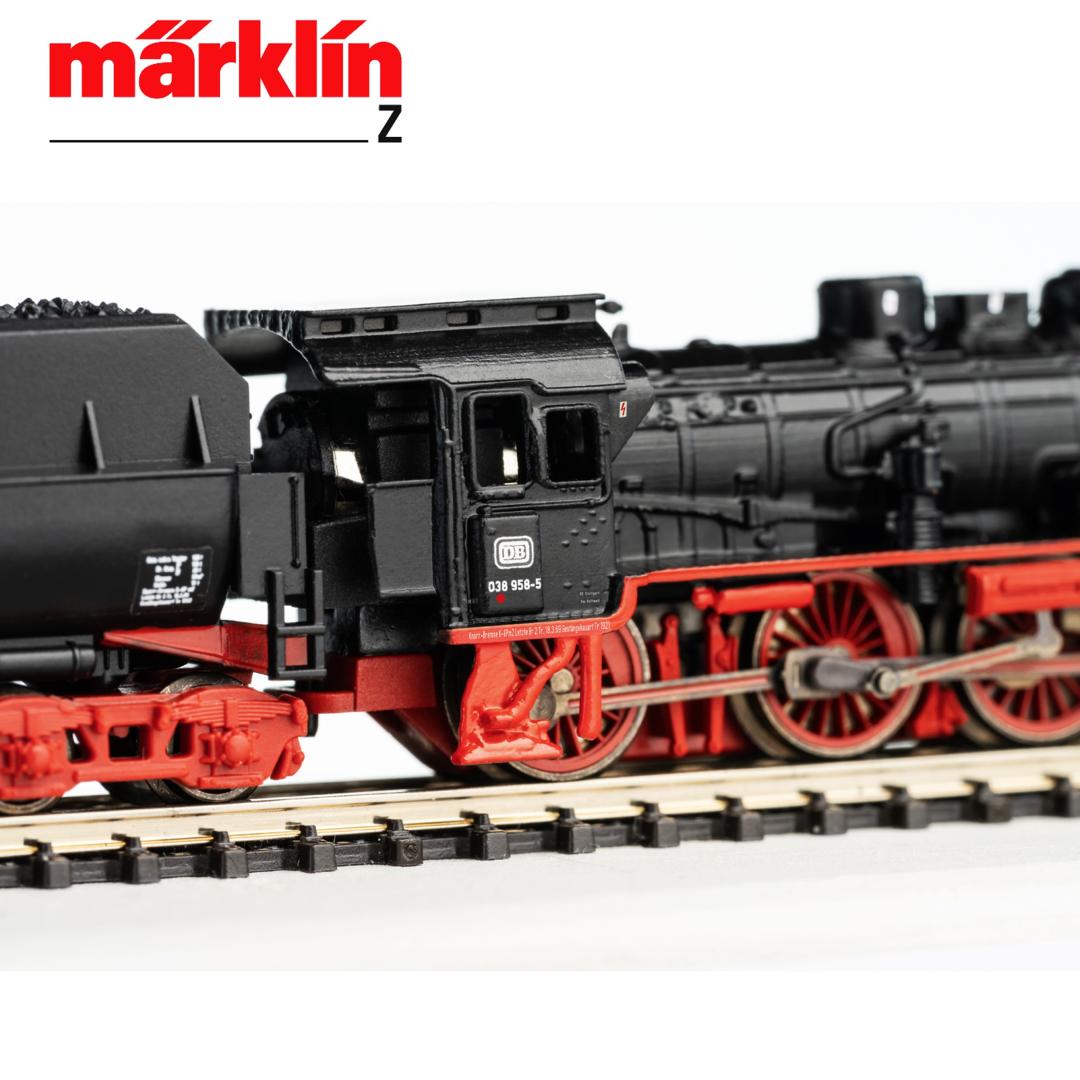 Modelo: Esta locomotora de vapor de la serie 038 cuenta con tres cúpulas de caldera, una caja inductiva en relieve y una reproducción del imán inductivo en el lado derecho. La carrocería está fundida en bronce fino y se ha trabajado a mano con esmero. El modelo cuenta con un motor con armadura en forma de campana. Cuenta con luces de cabeza triples con iluminación LED blanca cálida, detalles finos que imitan los frenos, dispositivos de despeje de carriles, placas de tope ampliadas, mecanismos de válvulas y bielas completamente funcionales y con detalles finos, y un completo esquema de pintura. Todas las ruedas motrices son motorizadas. Longitud sobre los tope: aproximadamente 98 mm