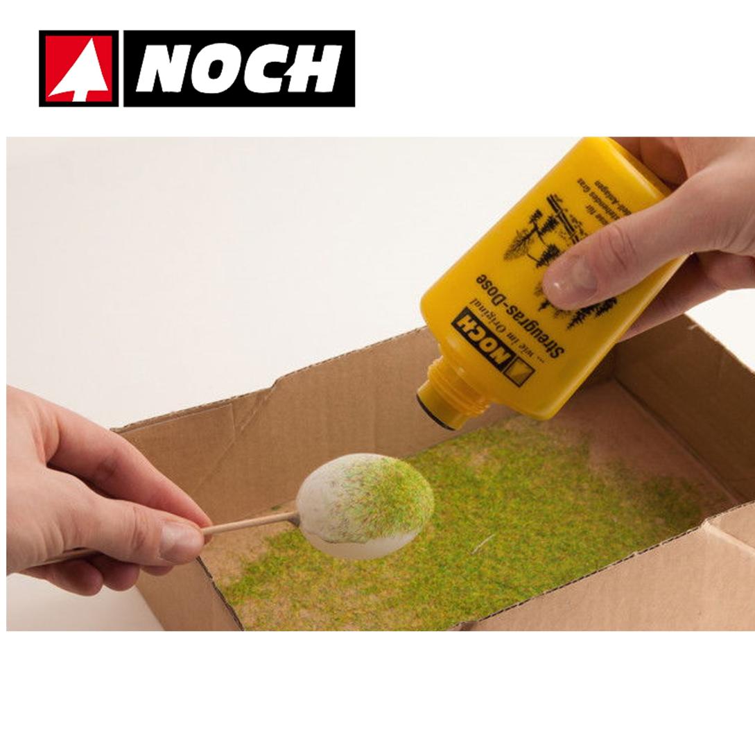 Puede aplicar Hierba Esparcidora NOCH de 1,5 mm y 2,5 mm de longitud, de forma natural. Las fibras de la hierba se cargan electrostáticamente durante la aplicación, manteniéndose erguidas sobre la superficie pegada. Este efecto se intensifica si llena la botella solo hasta la mitad al aplicar la Hierba Esparcidora.