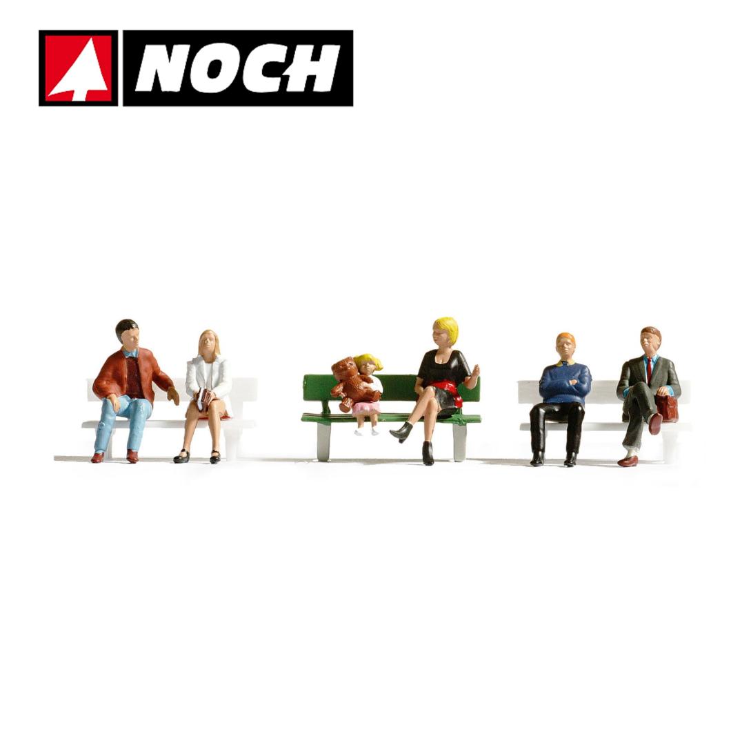 El set contiene seis figuras modelo pintadas a mano en escala H0 y un banco. (escala 1:87, aprox. 2 cm de alto).