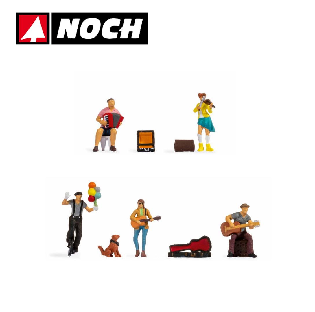 El Set de Figuras contiene 6 figuras: un guitarrista de pie, con gafas de sol, vaqueros y una camiseta marrón; y un guitarrista sentado, con pantalones marrón oscuro, una camiseta azul holgada y un sombrero. Además, ha dejado un estuche de guitarra en el suelo delante de él para guardar las monedas. También se incluye un acordeonista. Este último está sentado en un taburete con un acordeón rojo en el regazo. Lleva una camiseta rosa y pantalones cortos vaqueros. También ha dejado el estuche de su instrumento en el suelo delante de él. Otra figura toca el violín. Lleva una chaqueta amarilla, una falda corta azul y zapatos amarillos a juego. Un monociclista con globos completa la escena. Lleva pantalones negros con tirantes, guantes blancos y globos en una mano.