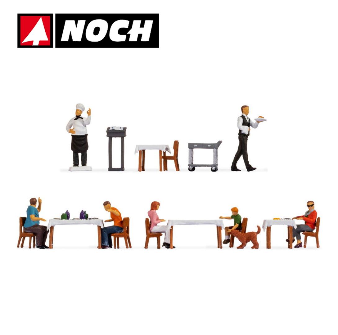 El set de figuras temáticas "Restaurante" de NOCH (n.° de artículo 16246) en escala H0 (escala 1:87) recrea con todo lujo de detalles el acogedor ambiente de un restaurante o cafetería al aire libre en su maqueta. El set incluye cinco comensales sentados, un perro y un atento camarero que cuida de su bienestar. También incluye una gran figura publicitaria con forma de chef, cuatro mesas, seis sillas, un carrito de servicio y un mostrador con menú.