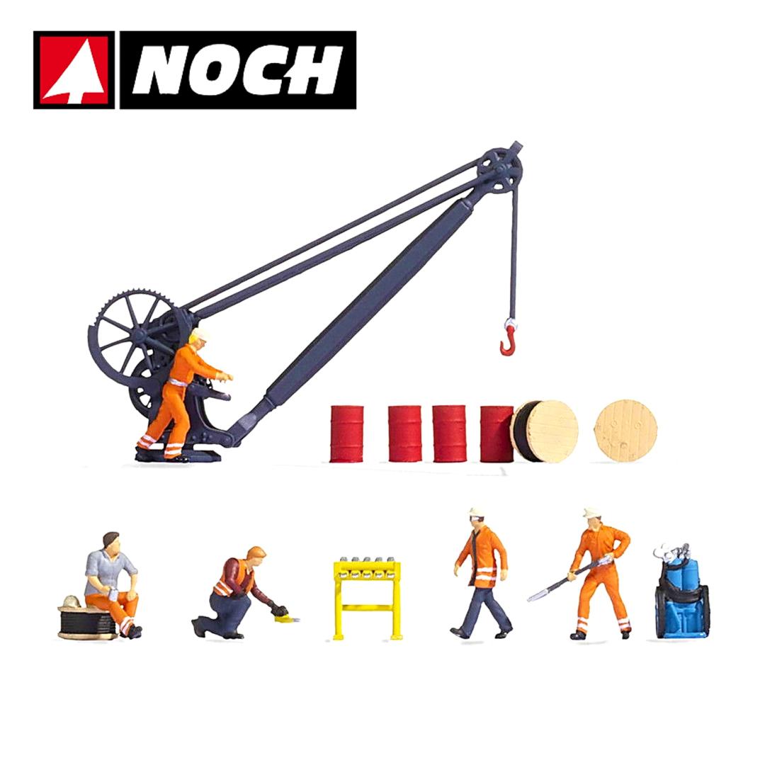 Las figuras incluyen un operador de grúa, un trabajador con zapata de freno, un capataz y otros trabajadores del ferrocarril. También se incluyen tambores de cable, barriles, un carro de soldadura y una grúa manual para completar la escena.