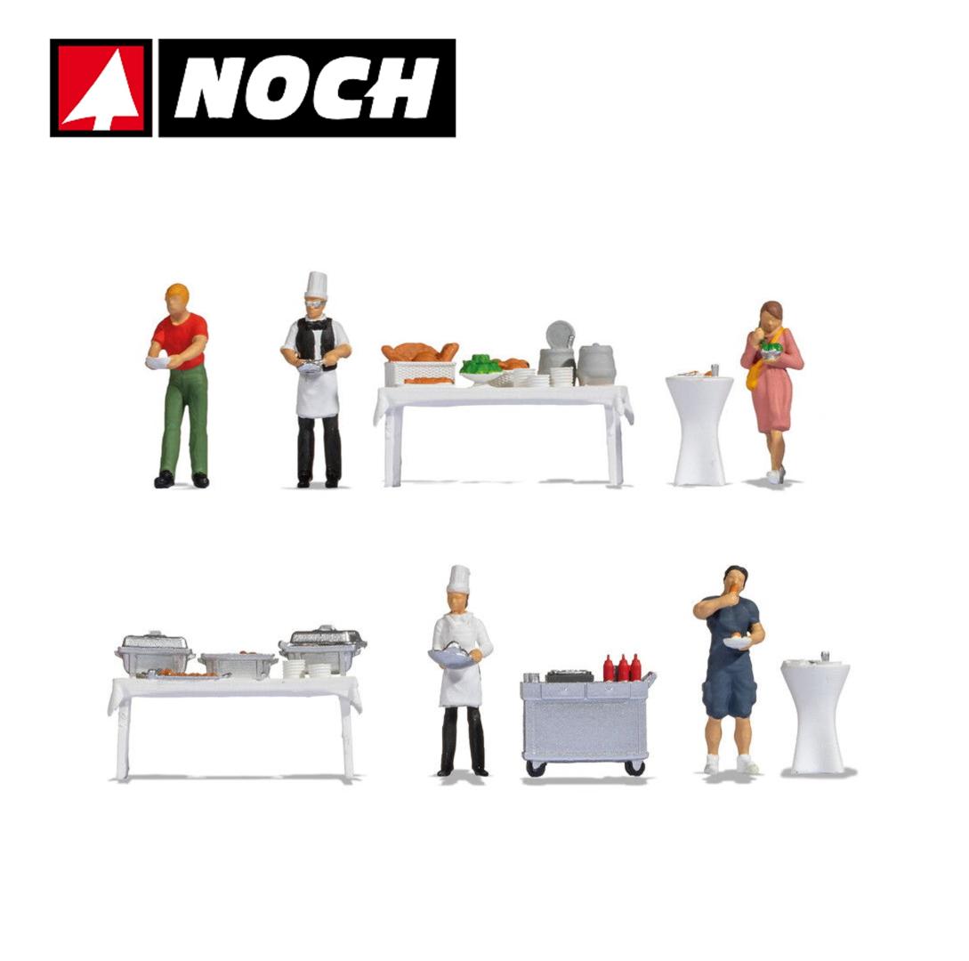Nuestros dos chefs preparan el plato principal al momento en las dos mesas de bar incluidas en el set, mientras que los tres invitados pueden colocar sus entrantes desde el carrito buffet provisto en sus dos mesas buffet y ¡comenzar a comer!