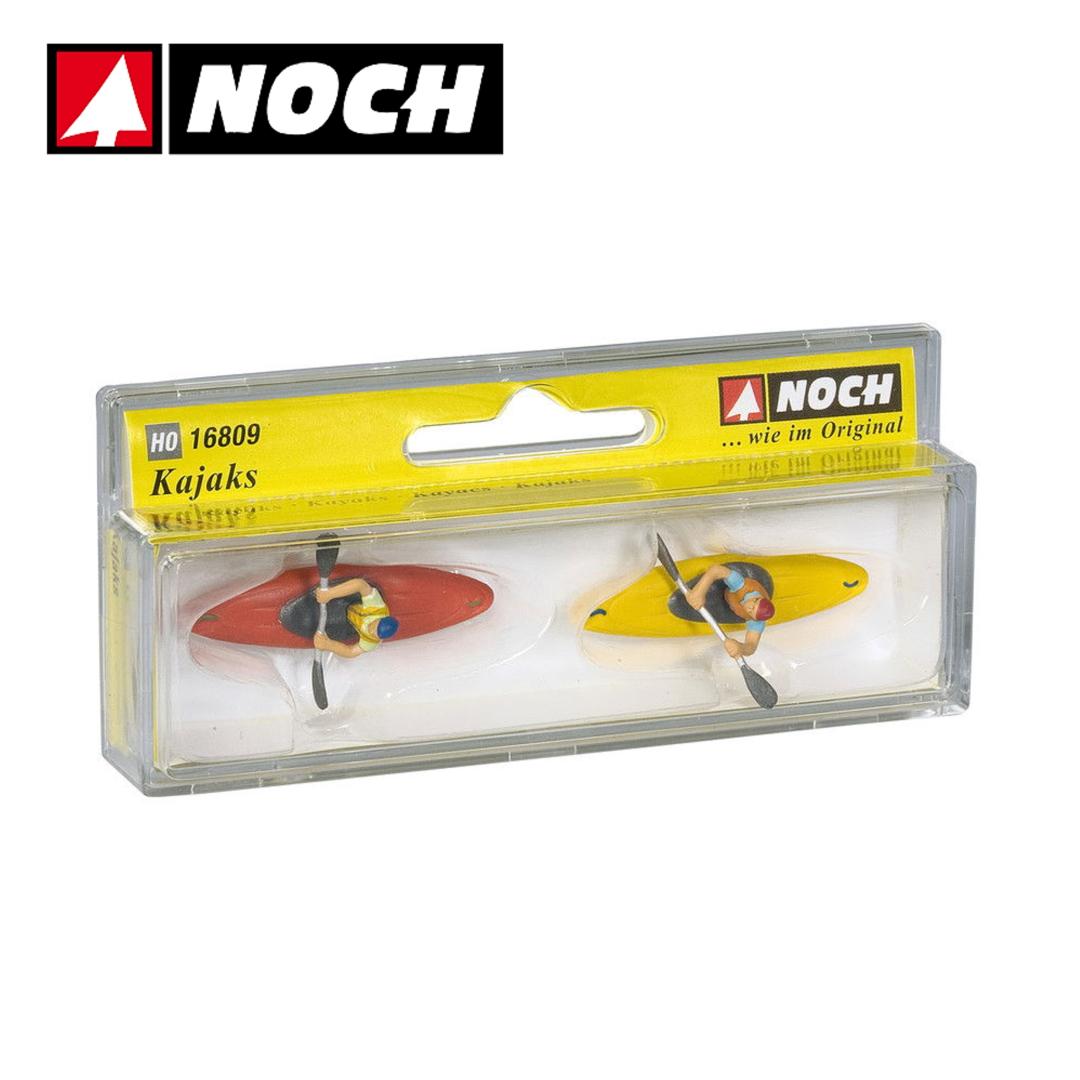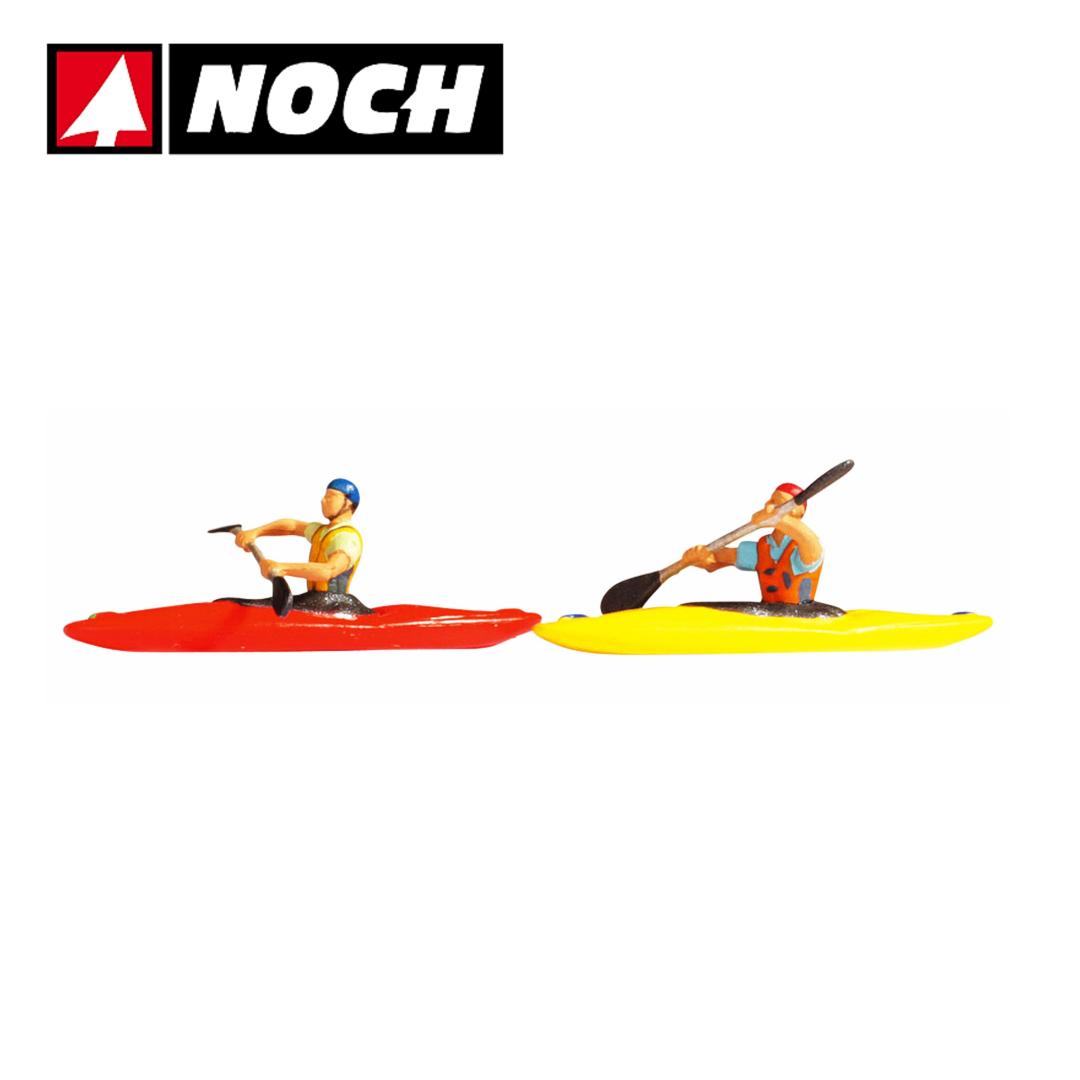 El set "Kayaks" para la escala H0 contiene dos kayaks pintados a mano, cada uno con un kayakista a bordo. Los kayaks también están diseñados en rojo y amarillo, lo que aporta un toque colorido a la maqueta. Las dos figuras están protegidas con cascos y chalecos salvavidas y usan un remo para desplazarse. ¡