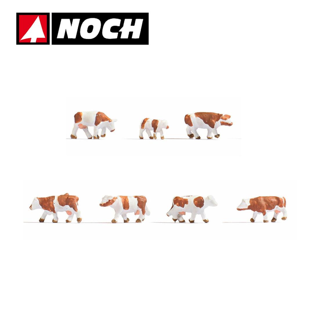 El set de figuras de vacas «Vacas, marrón-blanco» contiene siete figuras de vacas. Todos los animales están pintados a mano y se pueden usar en cualquier lugar de tu maqueta ferroviaria o diorama. Si quieres recrear una escena de granja con temática de granja, lo mejor es usar las vacas de NOCH. Las figuras son marrones y blancas, e incluso incluyen un pequeño ternero. Así, puedes diseñar la granja en miniatura de forma realista, igual que la original. Si buscas más variedad, también puedes usar las figuras «Vacas, negro-blanco» (ref. 44250) o las «Vacas, marrón» (ref. 44252). El paisajismo en miniatura te permite ser creativo y no pone límites a tu creatividad.