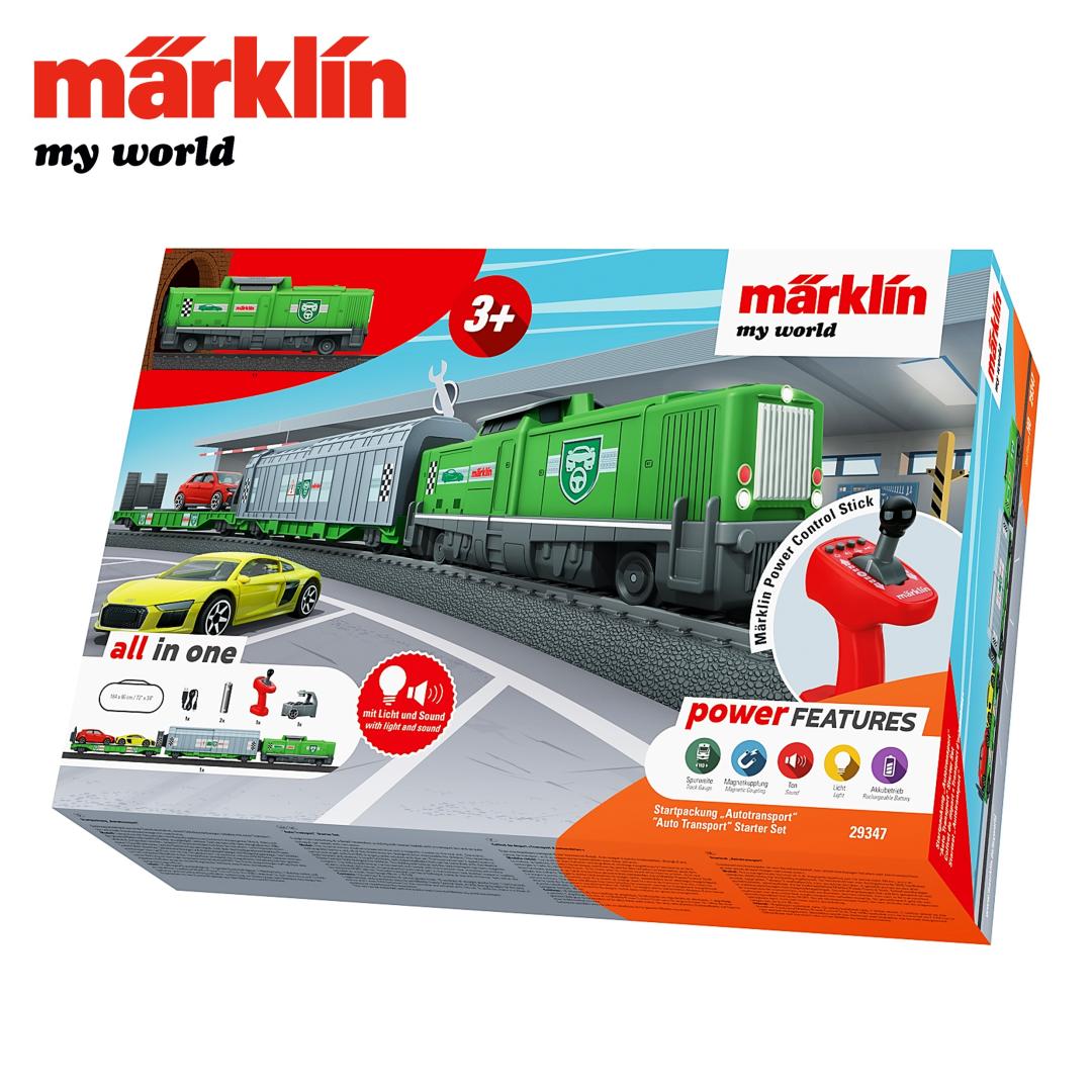 Circuito de iniciación Märklin My World "Auto Transport" compuesto por locomotora con luces y sonido y 2 vagones de mercancías, uno de ellos cargado con coches con los que se puede jugar por serparado. El tren se controla por un mando tipo "Joystick", con el cual se pueden activar las funciones de sonido y la iluminación. El circuito consta de 1 óvalo de 190x85 cm con 2 desvíos.