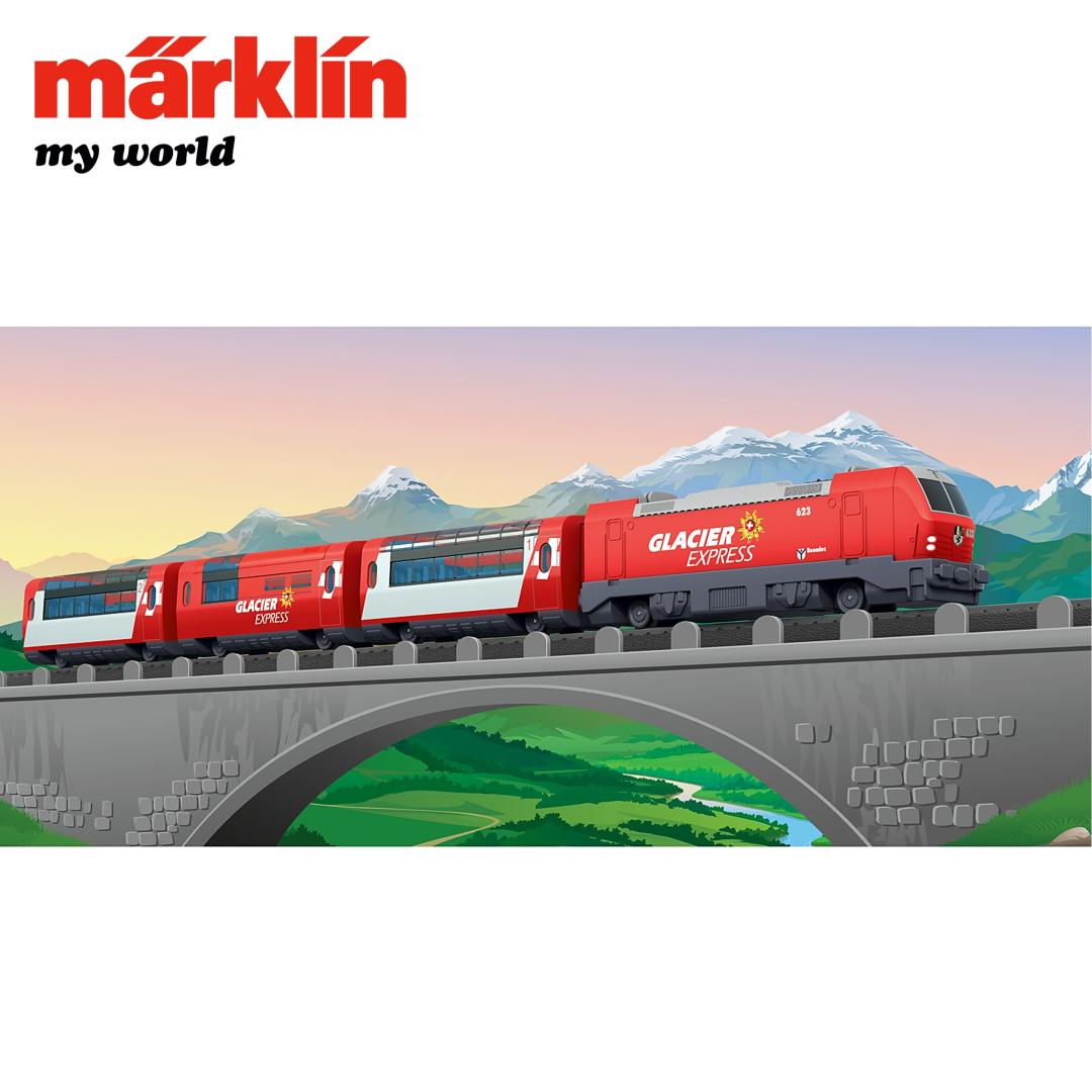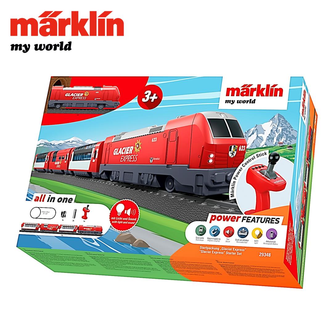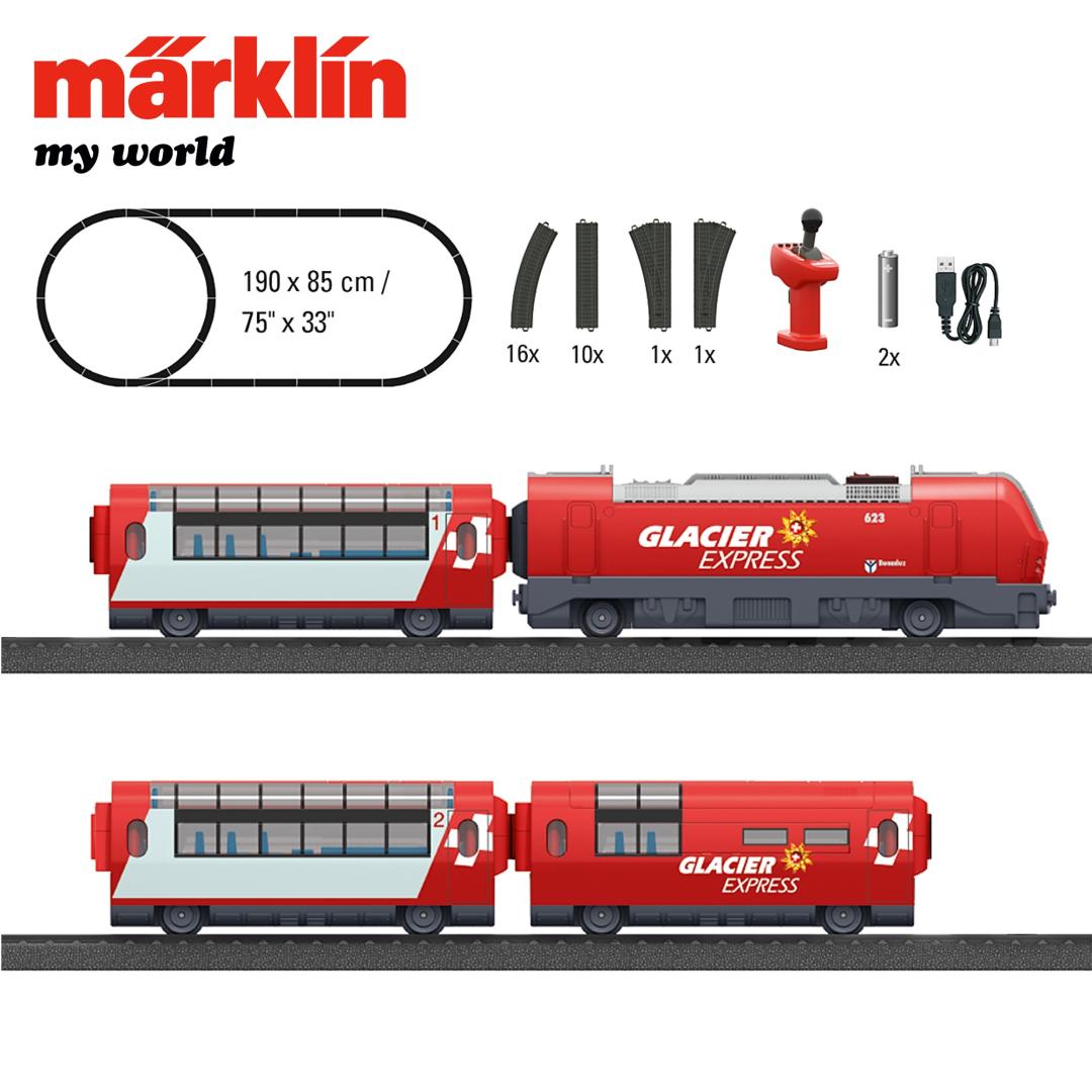 La locomotora cuenta con tracción a batería y un enganche magnético en la parte trasera. El motor, la batería recargable y todos los componentes electrónicos están diseñados para ser inaccesibles para los niños. La locomotora se puede recargar con el cable USB incluido. Tiene 3 velocidades tanto hacia adelante como hacia atrás, 3 efectos de sonido y tres faros que se controlan con el mando Märklin Power Control Stick, diseñado para niños. Los vagones panorámicos incluyen techos transparentes. Los techos de los 3 vagones son desmontables. Los vagones presentan detalles interiores. Longitud del tren: aproximadamente 50 cm / 19-11/16".