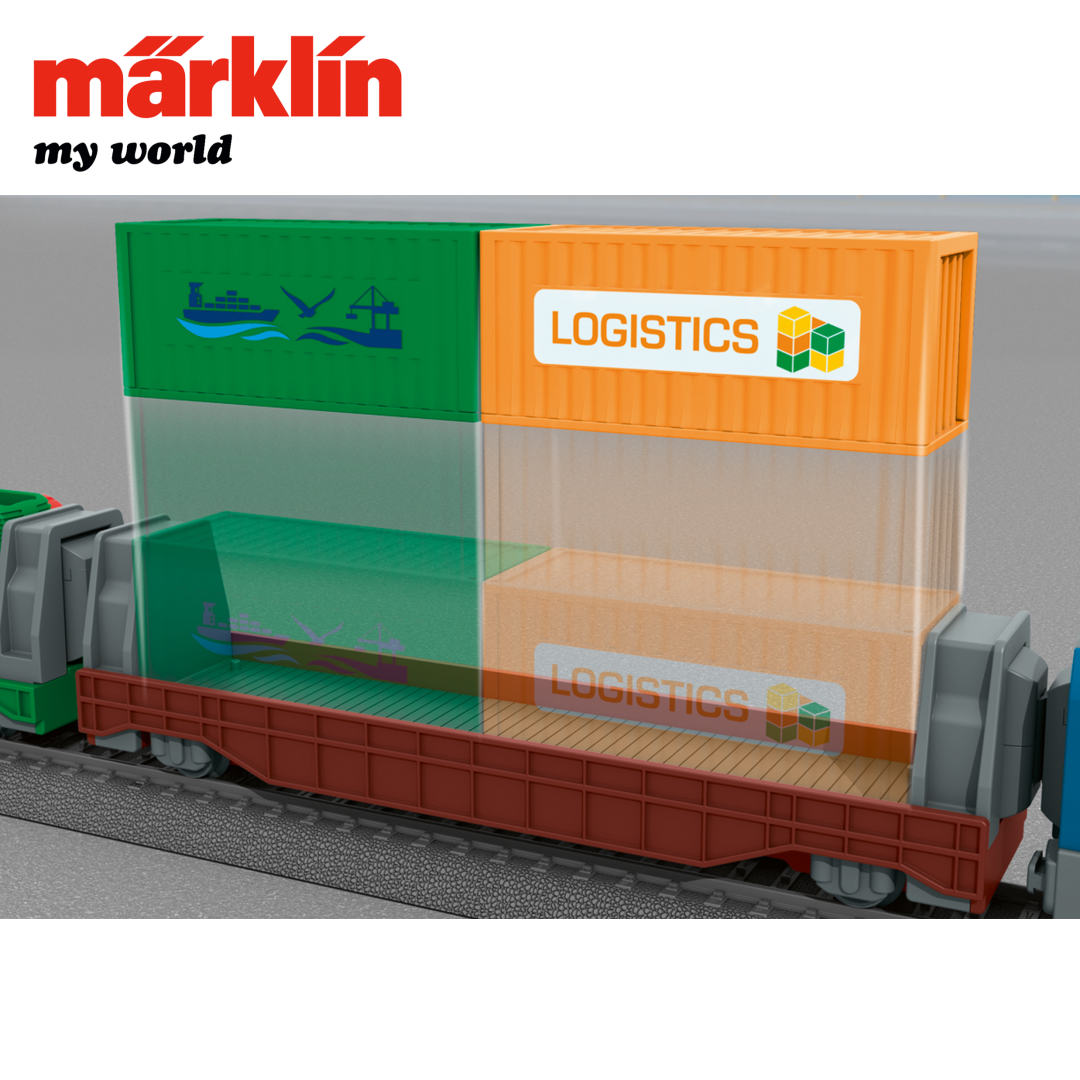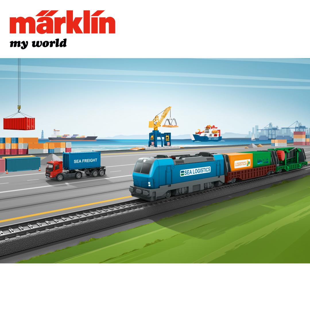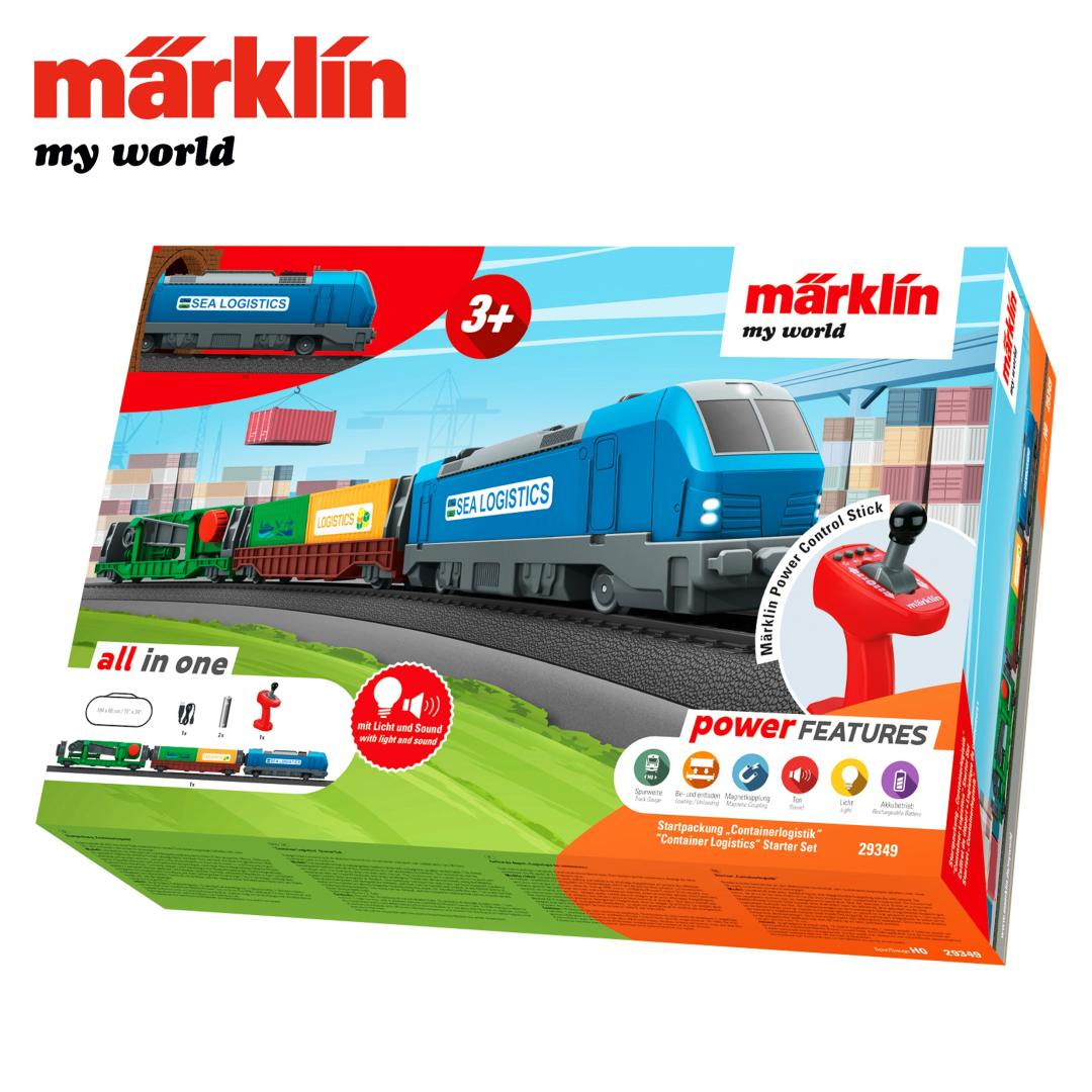 Contenido: 14 tramos de vía curva de plástico, 12 tramos de vía recta de plástico, 1 desvío a la izquierda, 1 desvío a la derecha y un práctico mando inalámbrico infrarrojo Märklin Power Control Stick. Incluye un cable de carga USB y 2 pilas AAA. Además, incluye una hoja de pegatinas con diferentes compañías ferroviarias y pegatinas temáticas de logística portuaria para decorar el tren. Este set se puede ampliar con las vías de plástico de la colección Märklin My World.