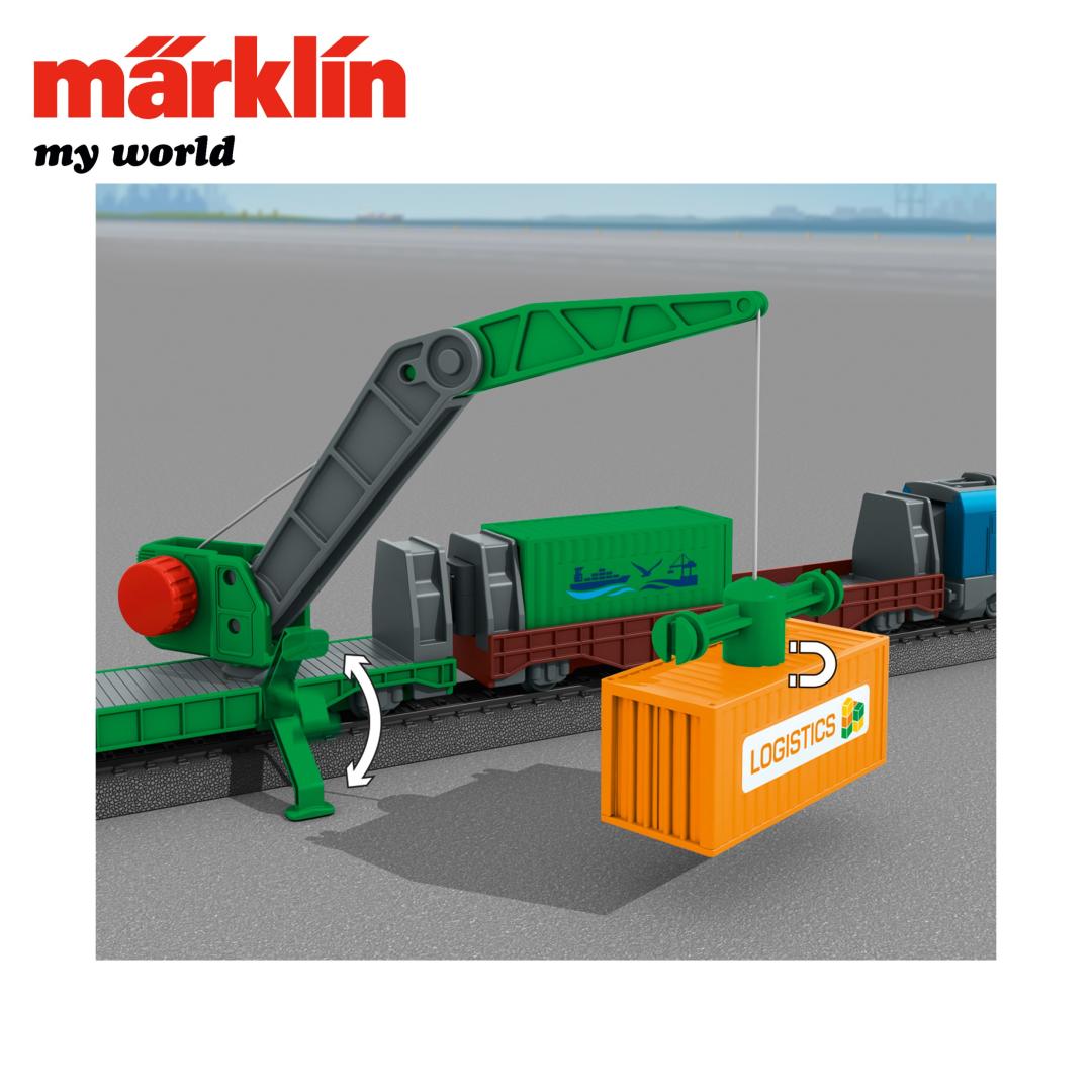 Modelo: La locomotora cuenta con un motor a batería recargable y un enganche magnético en la parte trasera. El motor, la batería y todos los componentes electrónicos son inaccesibles para los niños. La locomotora se puede recargar con el cable incluido. Tiene 3 velocidades hacia adelante y hacia atrás, 3 efectos de sonido y tres faros. Todo se controla con el mando Märklin Power Control Stick, diseñado para niños. El vagón portacontenedores y el vagón grúa también tienen enganches magnéticos. Los robustos contenedores están diseñados para niños y se pueden abrir y cargar. Una pieza metálica fija en los contenedores permite la carga magnética con el vagón grúa incluido. El vagón grúa tiene 4 soportes de carga plegables. La grúa gira y el gancho de carga magnético se sube y baja con una manivela.
